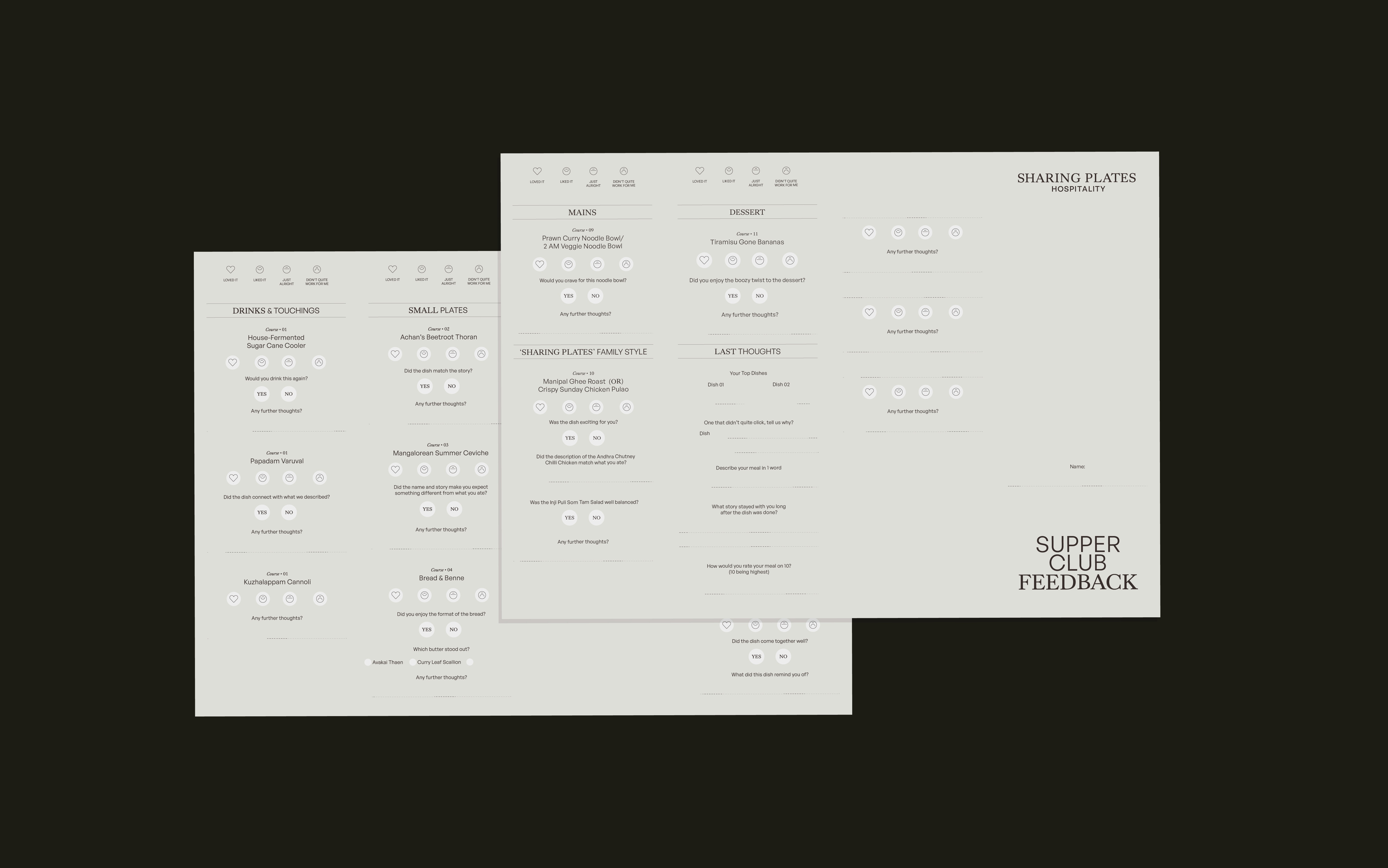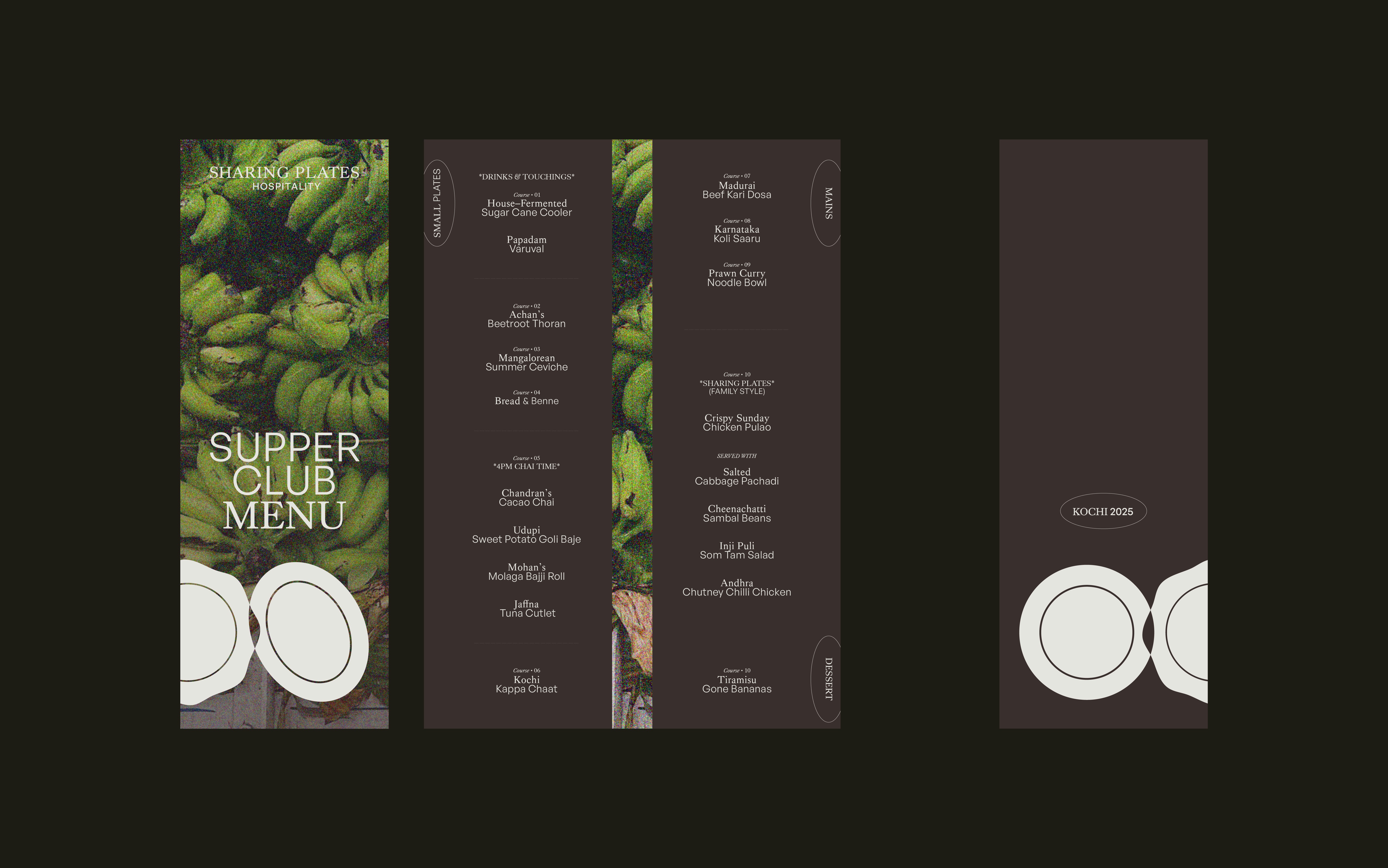 Sharing Plates Hospitality LLP is the vision of Vedha Chandra Sekhar, Niketa Mohan, and Velton Saldanha - three individuals united by their passion for hospitality and diverse experience across service, marketing, finance, and the kitchen. Based in Kochi, Kerala, the identity was inspired by the colours, flavours and textures of the area.